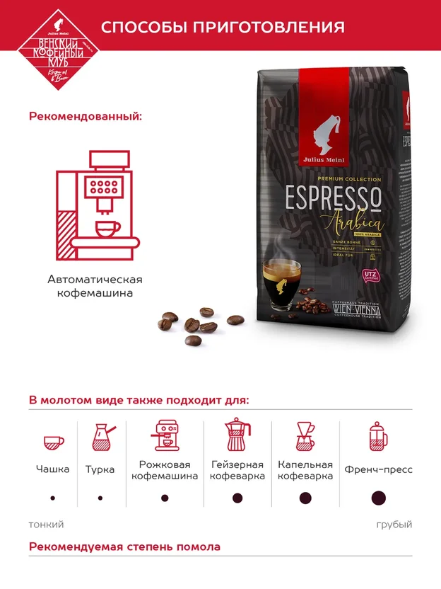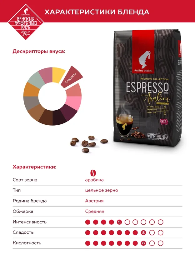 Тщательно отобранные зёрна арабики с лучших плантаций Бразилии и Центральной Америки придают бленду Julius Meinl Espresso Premium Collection свежий вкус. Julius Meinl Espresso Premium Collection (Эспрессо) - смесь отборных высококачественных сортов стопроцентной арабики с лучших плантаций Центральной Америки и Бразилии. Напиток имеет превосходный аромат, насыщенный вкус, сладкое длительное послевкусие и бархатистую устойчивую крема.